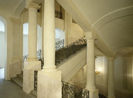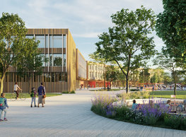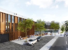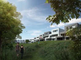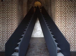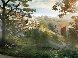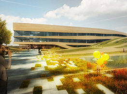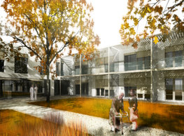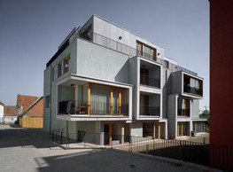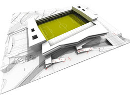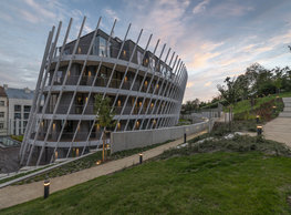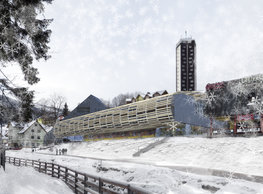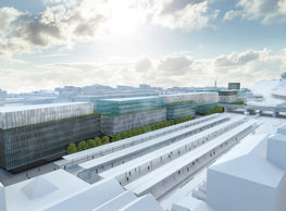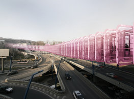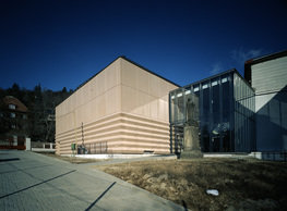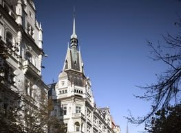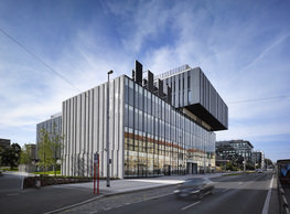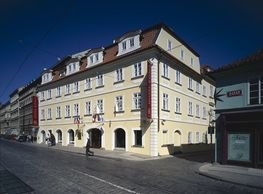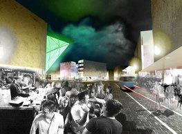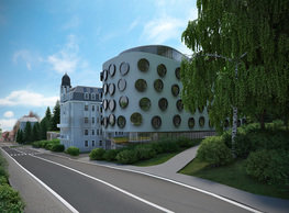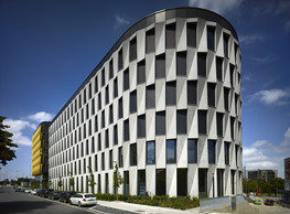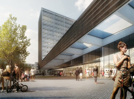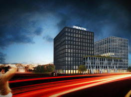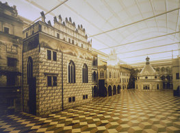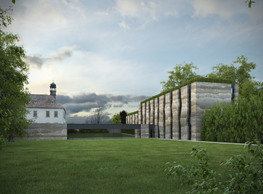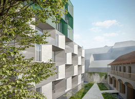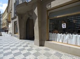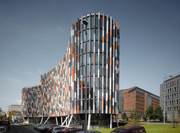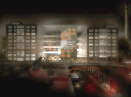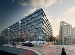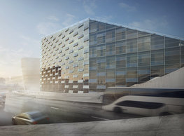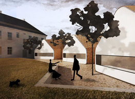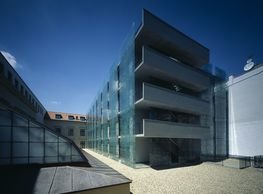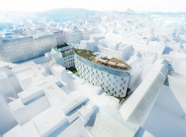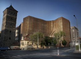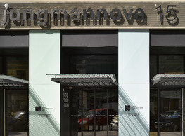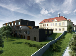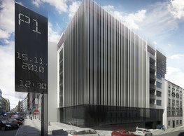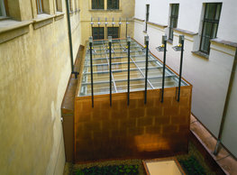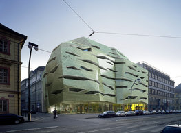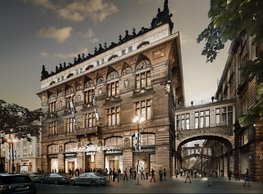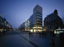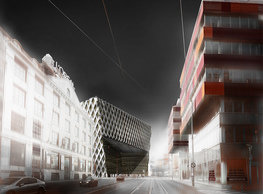 The concept of the new building designed by our studio builds on two fundamental principles. The first one is adding a calming mass to the entire front of a block of houses in Revoluční that would be able visually to unify the so far amorphous volumetric situation. The second principle is an absolute respect to the old building no. 1244; this means that the existence of this tiny listed house and the way the new building deals with the preservation and outlining of it is so important it becomes de facto the focal point of the newly composed building. The new structure establishes a somewhat calm, not disturbing background or a protective case. The filling matter – the ´dough of the city´ is first ´poured´ over the entire floor plan of the block’s front; that means including space where there is the listed Baroque house. Its limits are simple: the street line of Revoluční on the west, the site border on the north, the end of the blind gable wall of the added block, and the roof ridge of the Merkur Palace from the top. The weight of the mass is then made lighter and more light is brought in by cutting it into a set of vertical plates. The cutting direction, among other things, copies the line of the border between the Old and New Town coincidental with the axis of Revoluční. Then the most important phase of the shaping happens: the mass is peeled off so that its final shape would satisfy all needs of the vicinity. First, the volume is removed leaving a stately space for the Baroque house no. 1244 and a free belt of the courtyard along its southern side, no matter that this mass leans over the courtyard then. Second, the front of the mass to Lannova, jutting over the walkway, breaks to follow the street line of Revoluční. The mass is also cut away at the street level – we do this to keep (or better said improve) the Revoluční/Lannova crossing better arranged and conspicuous. We nevertheless do not just cut the mass away along the perimeter; the building is slit through perpendicularly to its ribbing. This way, a passageway is established connecting Revoluční to the courtyard and further on to Nové Mlýny. Offices and shops on the ground floor are accessed from here on both levels: on the streetscape level and – taking the staircase up – on the courtyard level behind the old Baroque house. The east and west sides of ribs are jacketed by perforated metal sheet in the colour of copper while the north/south fronts clad in smooth sheet metal. The inner skin of the side facades behind perforated sheet metal is a curtain wall with operable windows allowing daylighting and views from the inside out through a light ´veil´ of these perforated sheet metal panels. Our intention is to work with reference to the old state of the place before the house no. 1502 was demolished. The abstract perforated rainscreen provides an opportunity to become a carrier of the image of its predecessor. Because the house is replaced by a new building, a glimpse of a memory of its appearance remains here. The Neo-Classicist envelope to Revoluční is the only historically valuable part of the demolished house. The transformed image of the old frontage can be ´tattooed´ into the envelope by engraving, imprinting, or perforating in such a manner and graphic contraction legible not at close range, but from a distance – for instance from the opposite side of the street. A passer-by will perhaps recognise the introduced image at the ´second sight´. The dabbed graphics, therefore, does not weaken the initial concept of abstract statuary working with mass and is not the primary topic for the building, but it is used as a reminiscence for the insiders, slipped behind the front(p)age.